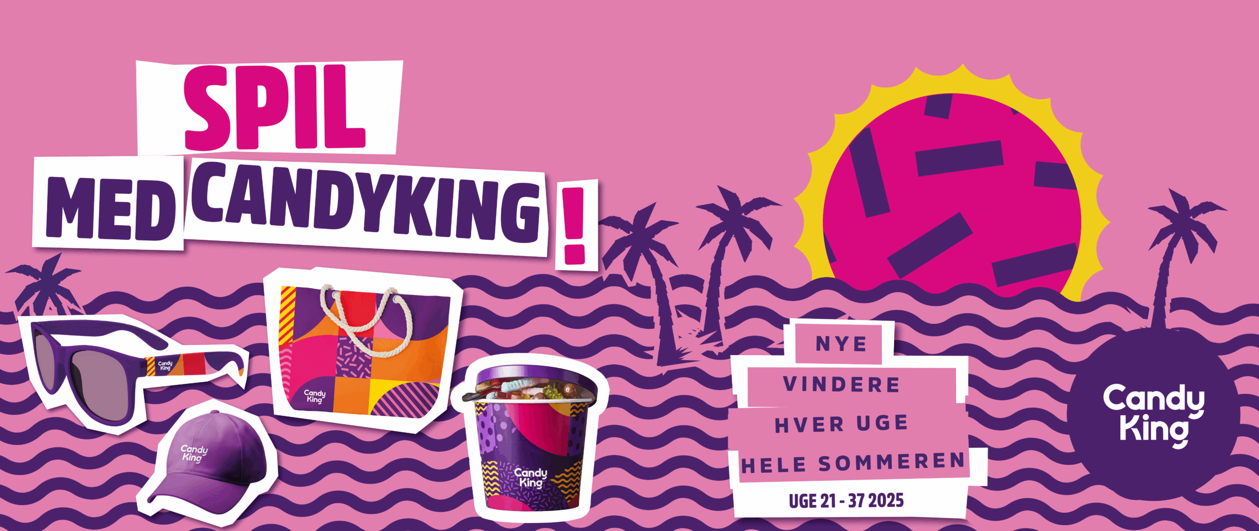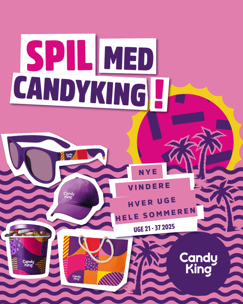 Gør sommeren ekstra solrig med CandyKing! Spil vores spil og få en chance for at vinde et CandyKing sommersæt. Du kan spille spillet ved at gå til kampagnens URL (https://gamecenter.flarie.com/5af728bb-06d9-47b8-8d7d-94386989671d) og trykke på afspil-knappen. Stryg skærmen for at flytte blokkene og placere dem på spillebrættet. Du kan maksimalt spille tre (3) gange om dagen. Hver gang du afslutter en runde og scorer mindst 1 point i spillet, samler du et lod til den ugentlige lodtrækning. Du kan øge din chance for at vinde den endelige lodtrækning ved at samle flere lodder. Der er 1 hver uge blandt alle spillere, der har spillet i den pågældende uge. De heldige vindere modtager et sommersæt bestående af CandyKing bland-selv-slik favoritter, strandtaske, solbriller og cap.