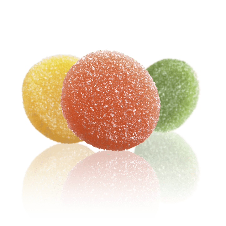 sukker, glukosesirup, stivelse, syre (citronsyre), aromaer, farvestoffer (E120, E141, (beta)-carotener)