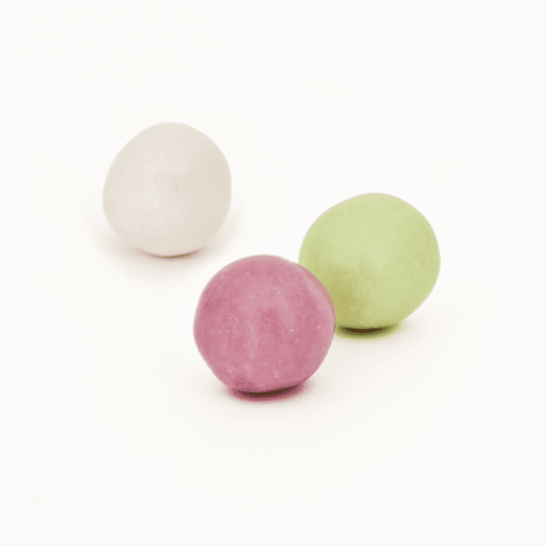 sukker, glukosesirup, helt hærdet vegetabilsk olie (palmekerne, kokos) i varierede mængder, fedtreduceret kakaopulver, risstivelse, fortykningsmiddel (gummi arabicum), emulgeringsmiddel (lecitin), aromaer, konsistensmiddel (invertase), overfladebehandlingsmidler (carnaubavoks, bivoks), farvestoffer (kobber komplekser af chlorophyller, rødbede rød, curcumin). Kan indeholde spor af MÆLK.