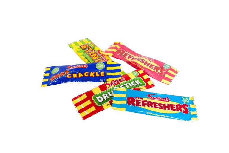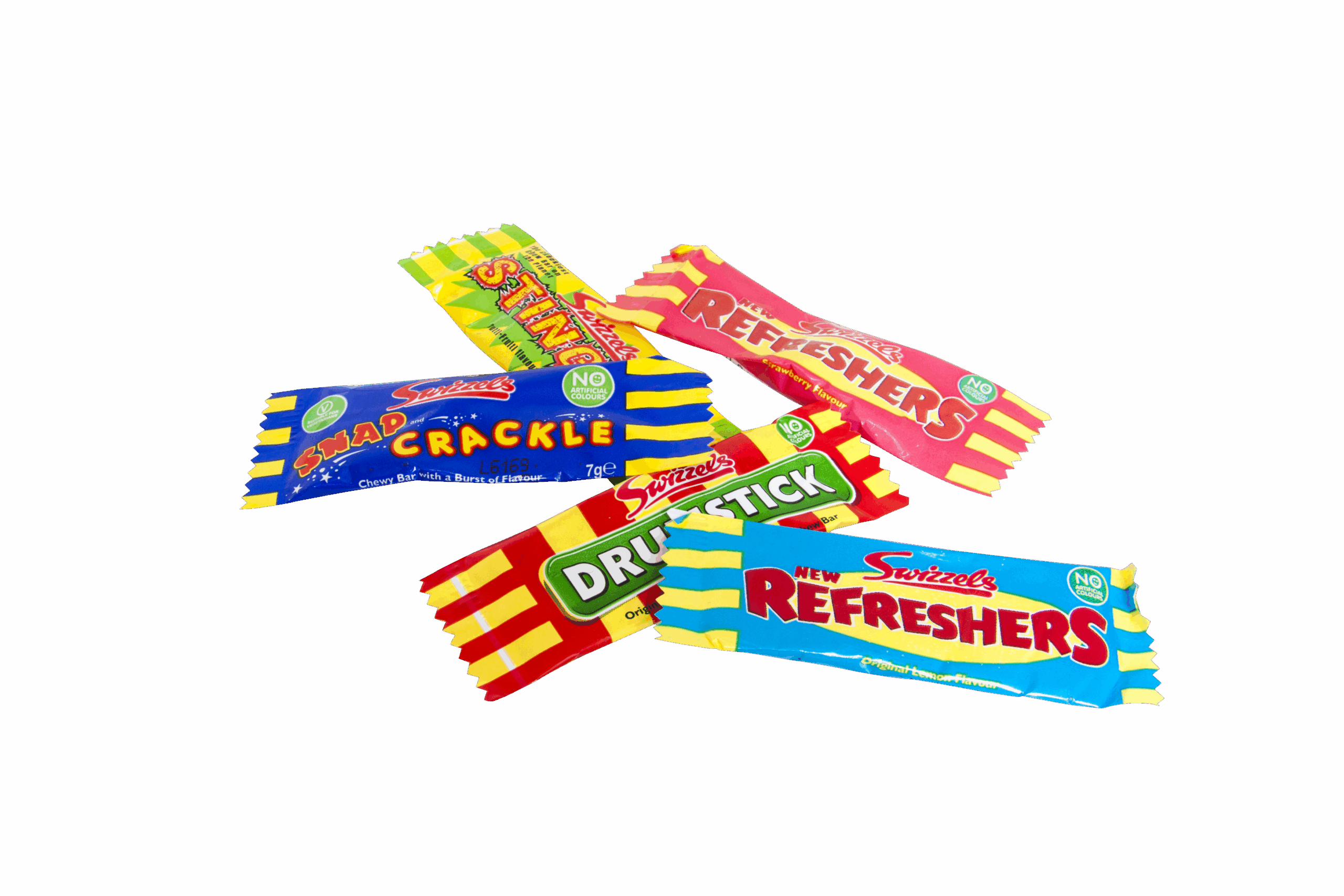 glucose syrup, sugar, vegetable oils (palm, palm kernel), acidity regulators (citric acid, malic acid), flavourings, lysed SOYA protein, modified starch, anti-caking agents (stearic acid, magnesium carbonate, magnesium stearate), emulsifier (mono- and diglycerides of fatty acids), colours (ammonia caramel, anthocyanins, copper complexes of chlorophylls, lutein).
