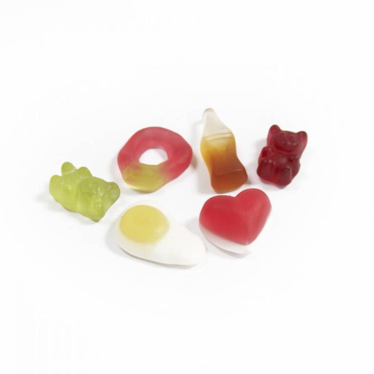 Glucose syrup, sugar, water, gelatine, acidity regulator (citric acid), concentrated white grape juice, glazing agents (coconut oil, carnauba wax), natural flavourings, thickener (pectin), safflower concentrate, spirulina concentrate, concentrated black carrot juice, caramel sugar syrup.