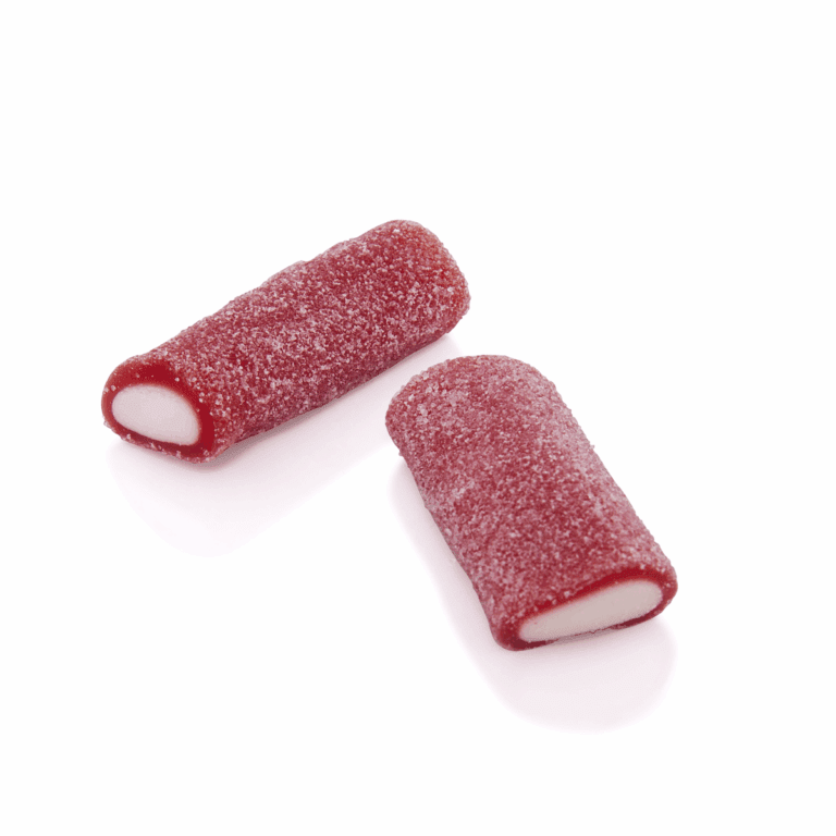 Sugar, glucose-fructose syrup, invert sugar syrup, WHEAT flour, starch, coconut fat, acids (malic acid, citric acid), humectant (glycerol), potato starch, gelatine, flavouring, concentrate (carrot, blackcurrant), colours (carmines). May contain traces of SOYA and mustard.