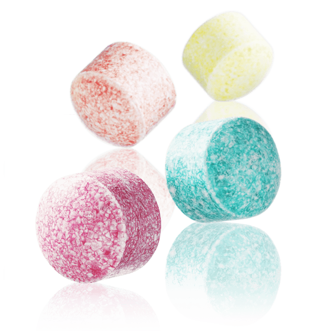 Sokeri, pintakäsittelyaine (E470b), happo (E330), glukoosisiirappi, aromi (appelsiiniöljy, päärynä, vadelma, sitruuna), väriaineet (saflori, E120, E131).