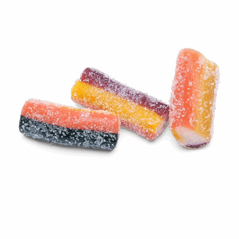 sokeri, glukoosi-fruktoosisiirappi, inverttisokerisiirappi, vehnäjauho (sisältää GLUTEENI), maissitärkkelys, kookosrasva, hapot (omenahappo, sitruunahappo), kosteudensäilyttäjä (glyseroli), perunatärkkelys, maltodekstriini, sakeuttamisaine (arabikumi ), aromi, happamuudensäätöaine (kaliumsitraatti), tiiviste (porkkana, hibiskus, mustaherukka, omena, retiisi, kurpitsa, tomaatti), suola, väriaineet (E100, E141). Saattaa sisältää SOIJAA ja sinappia.