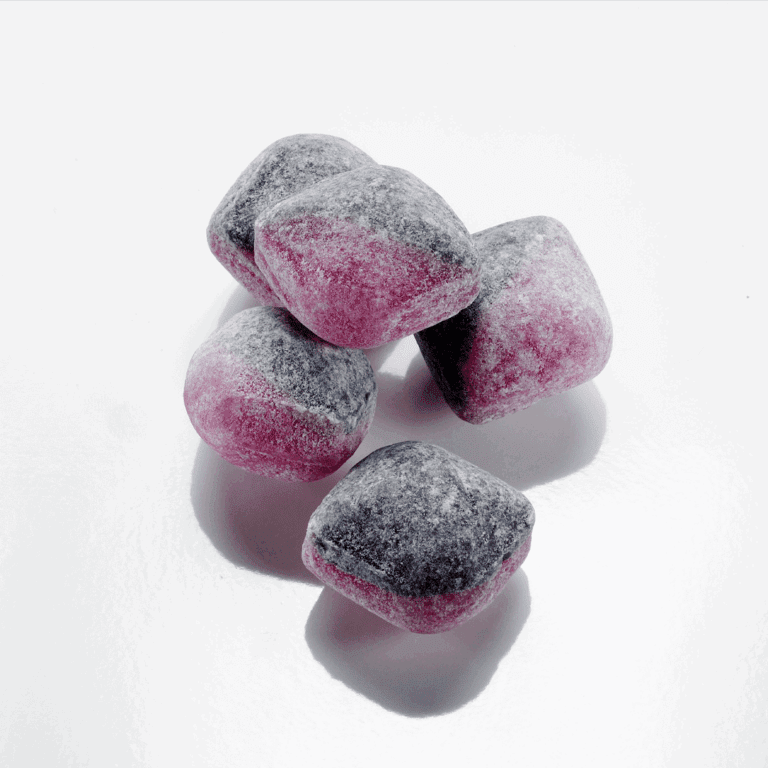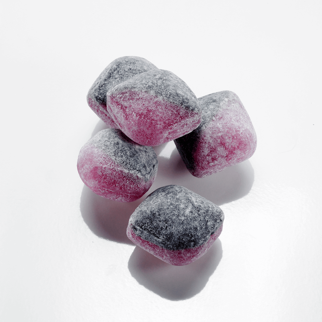 Sukker, glykosesirup, surhetsregulerende middel (E296), ammoniumklorid, aroma, fargestoffer (E120, E153).