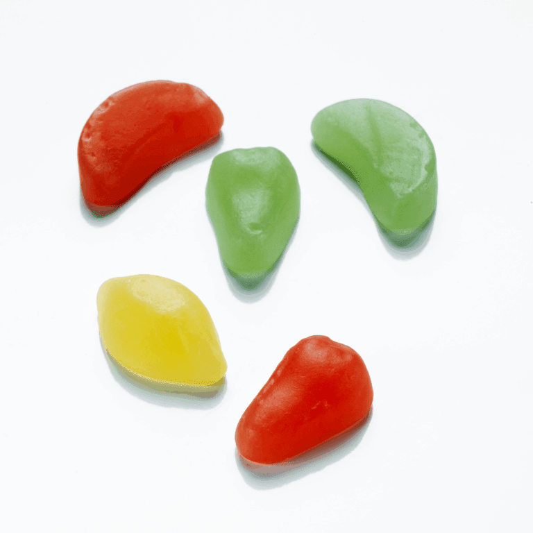 Socker, glukossirap, gelatin (svin), stärkelse, syra (E270), vegetabiliska oljor (kokos, raps), aromer, ytbehandlingsmedel (karnaubavax), färgämnen (E120, E141, E160a).