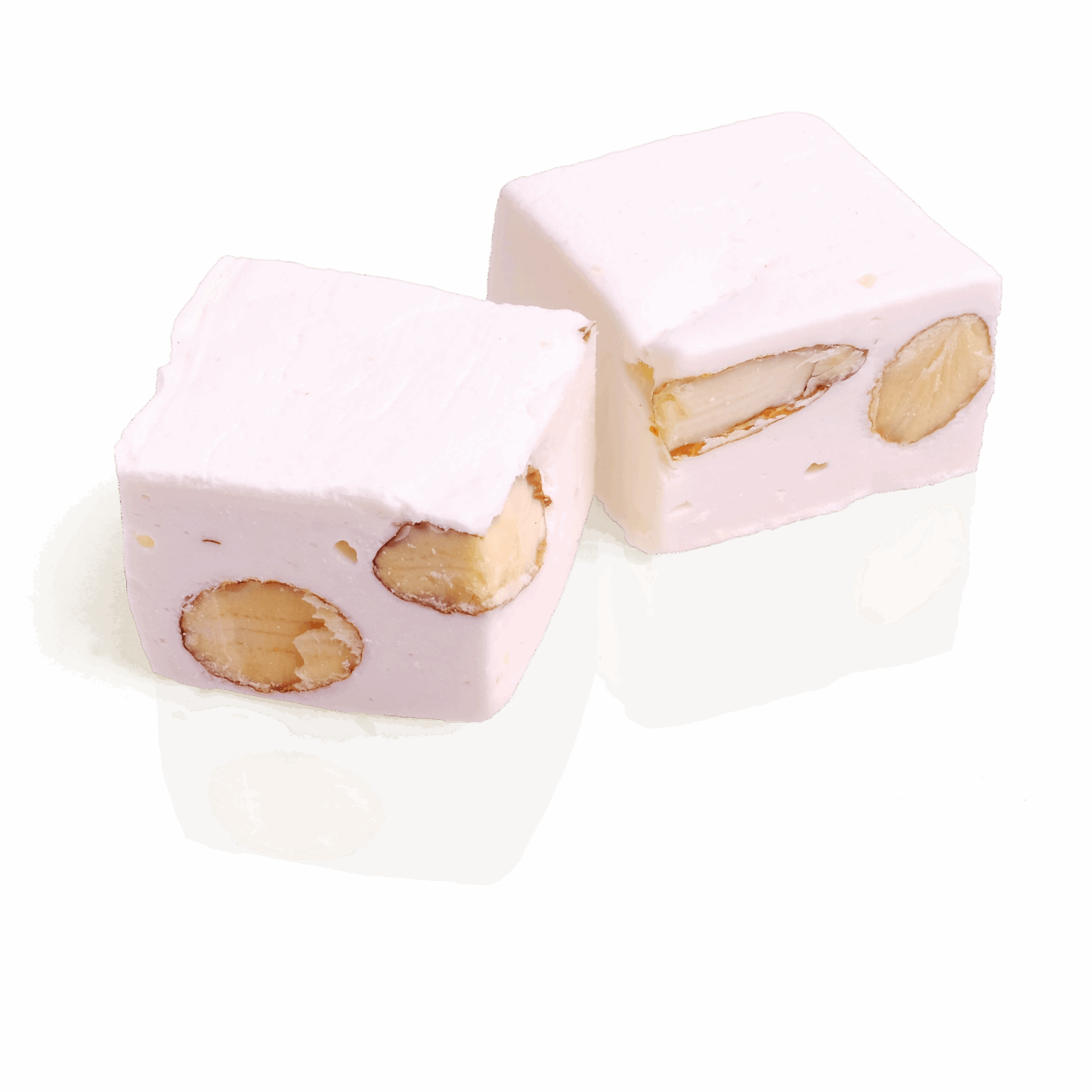 socker, glukossirap, MANDEL 15%, vatten, vegetabiliska fetter (palm, kokos), ÄGGVITA pulver, SKUMMJÖLKSPULVER, naturliga aromer. Kan innehålla JORDNÖTTER och andra NÖTTER.